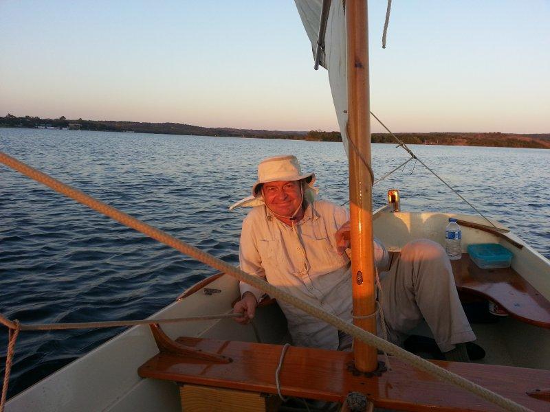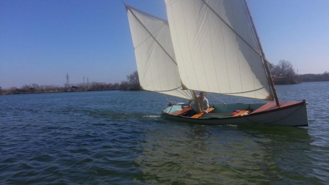 In 1987, I flew to Westport Point, Mass., from Austin, Texas, with tape measure, pencil, and pad and measured an old family boat that was on sawhorses in a field. It was probably built around the turn of the 20th century by Briggs.It has two planks per side and uses the inner lap as a riser for the two thwarts and sternsheets. There are four thwart knees, two hanging deck knees, and two quarter knees. She has a long relatively shallow centerboard, large skeg, and barndoor rudder. The type is well described in WoodenBoat magazine No. 66. In fact, it might have been described in that article but it came into Bob Baker’s possession afterwards.My father, Alden Ring, had sailed this boat through the 1960s and into the 1980s. He found it on a burn pile in about 1964, but I think he had owned it before years earlier. I understand this particular boat had a local reputation for speed and she does have a finer entry and is altogether narrower than others of the type measured and published by Bob Baker.Upon returning to Austin, I built this replica. In lieu of the original heavy cross-planked bottom, I used 1/2″ fir plywood as she lives on a trailer. Side planks are 3/4″ white pine. I’ve used a single 125sqft spritsail, but I prefer the 130sqft cat-ketch rig I am currently using. Over the years, three friends of mine have built their own copies using the same lines. The most recent, MARIE, was launched in Ft. Worth, Texas, by Bobby Taylor (September, 2014).