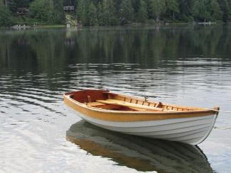 ABIGAIL TIINA is built to Simon Watts’ Sea Urchin design. The boat is planked in pine. Keel, timbers and gunwales are white oak, and transom, breasthook and quarter knees are mahogany. Construction took place in my parents garage during the pandemic, where I was always able to get a second pair of hands to help out. My Dad, Lee, and I had built a boat in our garage when I was a kid, so it was a great experience to build this one together all these years later. My kids helped me out by standing on the frames as we bent them into the boat and secured them in place.