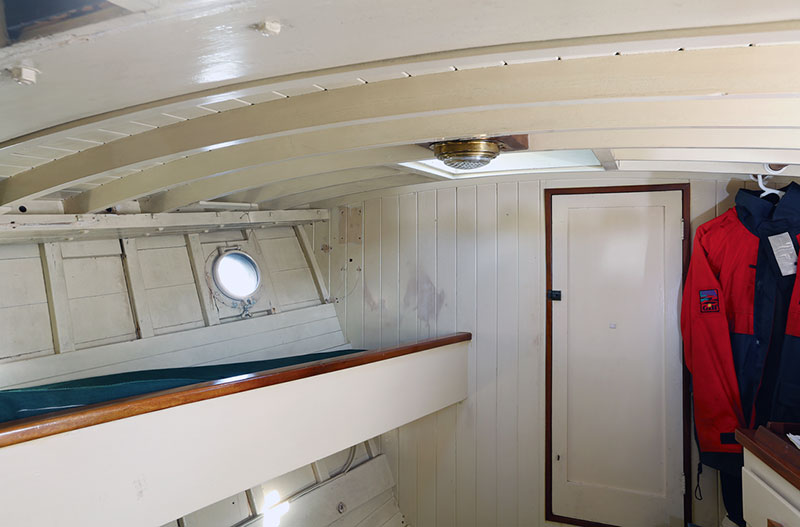The forward stateroom has two bunks, and the other four are in the commodious after cabin. The forward bulkhead door visible here allows access to a locker that holds 175′ of anchor chain. This photo also shows TRIXTER’s robust construction: steam-bent frames are connected longitudinally by a four-layered sheer clamp and two hull stringers per side.