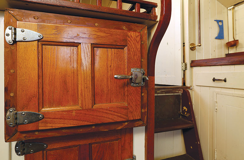 Just to port of the galley is the bar and ice chest. The mahogany bar is fitted out with storage for glasses and libations. The ice chest was originally cooled by an engine-driven compressor, but some years ago the compressor was removed. Still, the ample storage behind the paneled doors makes for reliable cold storage.