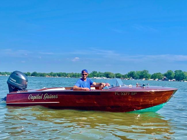 CAPITAL GAINES is a glass over plywood boat constructed with sapele frames, meranti marine plywood, with sapele and cypress accents. It’s powered with a Yamaha 70hp outboard motor.