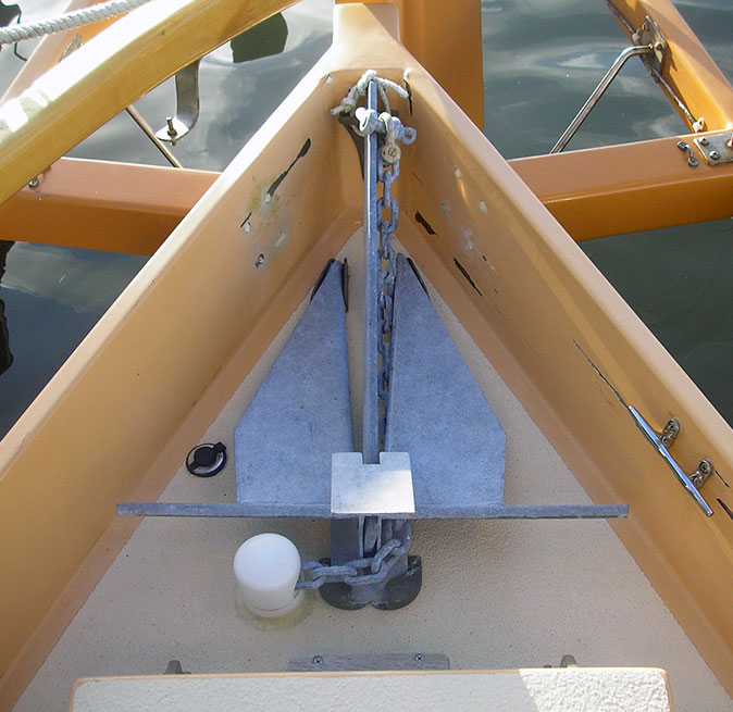 IBIS’ nylon anchor lizard attached to the chain rode with a chain hook; the anchor in the starboard roller is a “Max” I found in the dumpster in the boatyard; after trying it for a season I returned it to the dumpster