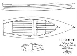 Here is a fine little working type punt that feels at home in the marshlands, as well as the open bay waters.She is 14'-9" long and was designed around a working load, with a draft of about 3". The nice flare of her sides gives good stability and the generous beam of 54" allows for a comfortable 48" rowing station. A short skeg keeps her tracking when rowing or punting. The decks are well crowned and the coaming will keep you dry in choppy conditions! There are removable floor boards and a storage rack under the afterdeck. The narrow transom offers stability and more displacement is using a small gas or electric outboard. Approxcimate weight is 200 lbs and she is easily trailable. Primary material calls for a 1/4" and 3/8" marine grade plywood and glued epoxy construction is ideal. No full size lnd steps to take for building. Plans are $95.00 by check or money order and a builders agreement is available for professional builders.