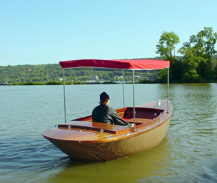 Scott Tobey writes that he "wanted a boat for exploring the lakes and streams of the Adirondacks so it had to be something silent and electric; something with a shallow draft and very maneuverable, ideally powered by two Minn Kota outboards with dual throttle control and power trim for launching and shallow water operation." The hull is of double-diagonal cedar planking over laminated white oak frames, sheathed in one layer of Kevlar and one layer of fiberglass cloth all covered in epoxy. The decks are edge-set mahogany planks payed with pigmented epoxy and finished with two layers of WEST epoxy and four layers of varnish. The hull is 18'4" overall, 15'6" at the waterline, beam is 5'9".