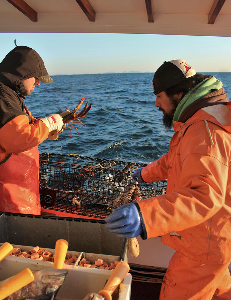 Sullivan and fellow crewman Keali’i Mano pick a trap clean on RESOLUTE’s rail. (And in case you’re wondering, no, Keali’i is not a typical Downeast name. He moved to Maine from Hawaii.) In the foreground, you can just see bait needles loaded with rockfish, which was trucked in, frozen, from the West Coast, that will be used for this day’s trawls. Rockfish is typical of what some lobstermen call “hard bait”: bigger fish that have been filleted, leaving a body with enough meat attached to last longer in traps set in the deeper water.