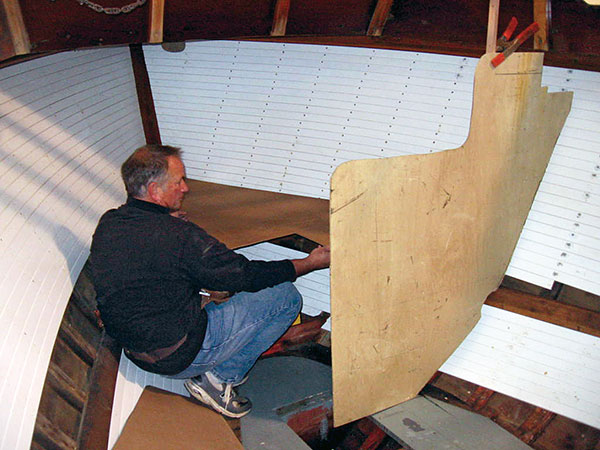Ed Gray fits patterns for new forward compartments and V-berths.