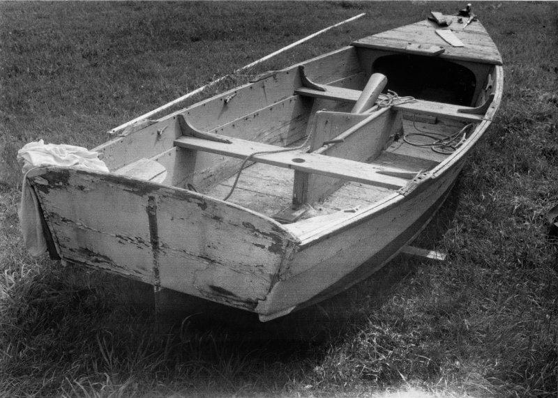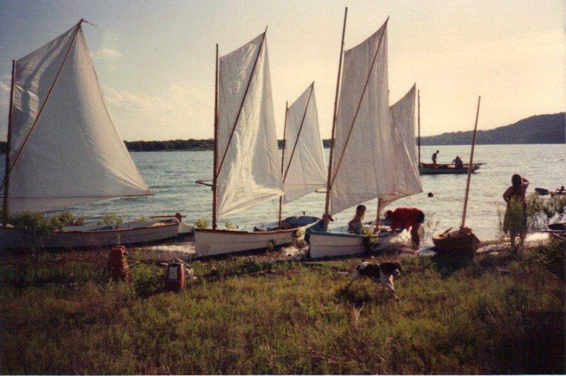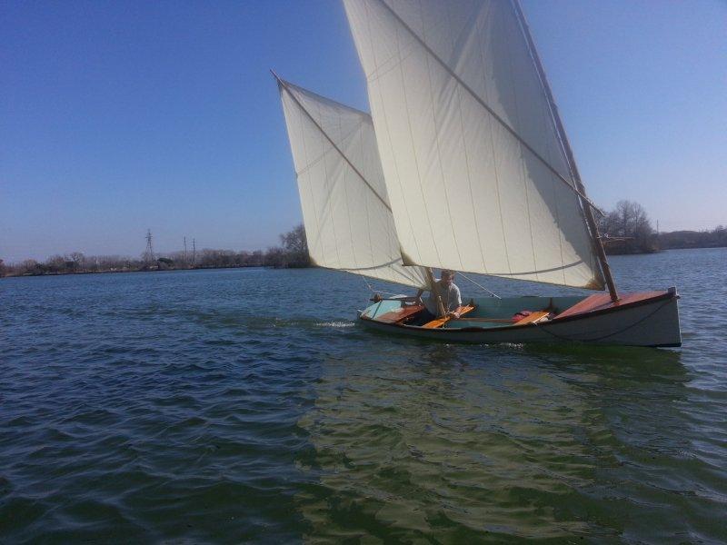 In 1987, I flew to Westport Point, Mass., from Austin, Texas, with tape measure, pencil, and pad and measured an old family boat that was on sawhorses in a field. It was probably built around the turn of the 20th century by Briggs.It has two planks per side and uses the inner lap as a riser for the two thwarts and sternsheets. There are four thwart knees, two hanging deck knees, and two quarter knees. She has a long relatively shallow centerboard, large skeg, and barndoor rudder. The type is well described in WoodenBoat magazine No. 66. In fact, it might have been described in that article but it came into Bob Baker’s possession afterwards.My father, Alden Ring, had sailed this boat through the 1960s and into the 1980s. He found it on a burn pile in about 1964, but I think he had owned it before years earlier. I understand this particular boat had a local reputation for speed and she does have a finer entry and is altogether narrower than others of the type measured and published by Bob Baker.Upon returning to Austin, I built this replica. In lieu of the original heavy cross-planked bottom, I used 1/2″ fir plywood as she lives on a trailer. Side planks are 3/4″ white pine. I’ve used a single 125sqft spritsail, but I prefer the 130sqft cat-ketch rig I am currently using. Over the years, three friends of mine have built their own copies using the same lines. The most recent, MARIE, was launched in Ft. Worth, Texas, by Bobby Taylor (September, 2014).