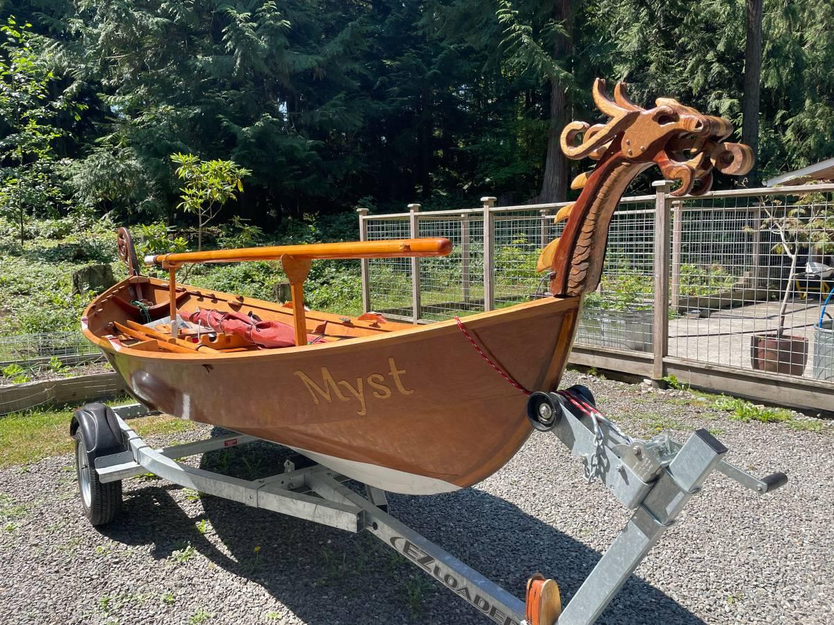 MYST is an Oughtred Elfyn, built in Vancouver, British Columbia, Canada, and now sailing Puget Sound from Whidbey Island, Washington, USA. She features a lug rig, daggerboard, internal box rudder, and, ornate dragon stem and stern pieces. She rows beautifully and sails well.