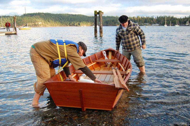The Northwest School of Wooden Boatbuilding, located in Port Hadlock, Washington, launched this Nordlund skiff in December last year. Built by instructor Ben Kahn’s 2013 Basic Boatbuilding Class, it is 11′ long, and weighs just over 100 pounds. The skiff is planked with western red cedar and Alaska yellow cedar over sawn frames. Guards and floorboards are Port Orford cedar. The stem and transom are sapele, and the oar pads are black locust. The class finished it with a mixture of teak oil and varnish that they call “boat sauce.” It is certified to safely carry 640 pounds with a maximum capacity of 710 pounds.The Nordlund skiff was drawn by designer and boatbuilder Dale Nordlund in the mid-1950’s as a practical flat-bottomed boat. Dale lives on Marrowstone Island on Washington’s Olympic Peninsula. The version built by the school was drawn by Dale in 1971. These boats are sometimes referred to as “flat-iron”, “flat-irons” or just plain “flatties.” When viewed from above, their shape looks like the old fashioned metal iron used to press clothes at the beginning of the 20th century.The Northwest School of Wooden Boat Building is an accredited, non-profit, vocational school. Its mission is to teach and preserve the fine art of wooden boatbuilding and traditional maritime crafts. They build both commissioned and speculative boats for sale while teaching students the boatbuilding skills they need to work in the marine trades. Find out more on our website at www.nwboatschool.org, e-mail us at info@nwboatschool.org, or call 360-385-4948.Pete LeenhoutsDirector, The Northwest School of Wooden Boatbuilding42 N Water StreetPort Hadlock WA 98339360-385-4948www.nwboatschool.org or find us on Facebook