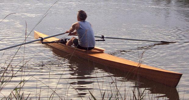 Michael Lampman built the hull of this 20' MacKenzie Boats rowing scull from Atlantic white cedar wood strips covered with epoxy. The trim is Honduras mahogany. The boat, which he named SOLITAIRE, weighs only 31 pounds. Michael uses his scull on the waters near Tallahassee, Florida.