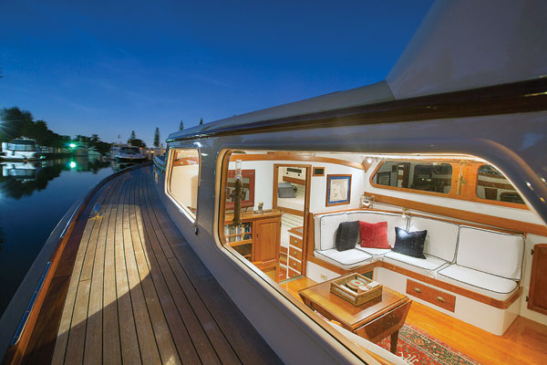 A sense of airy spaciousness and good outward visibility were goals of Ray Hunt and his designers. The spacious saloon remains fitted with the curved-back settee specified on the original drawings.
